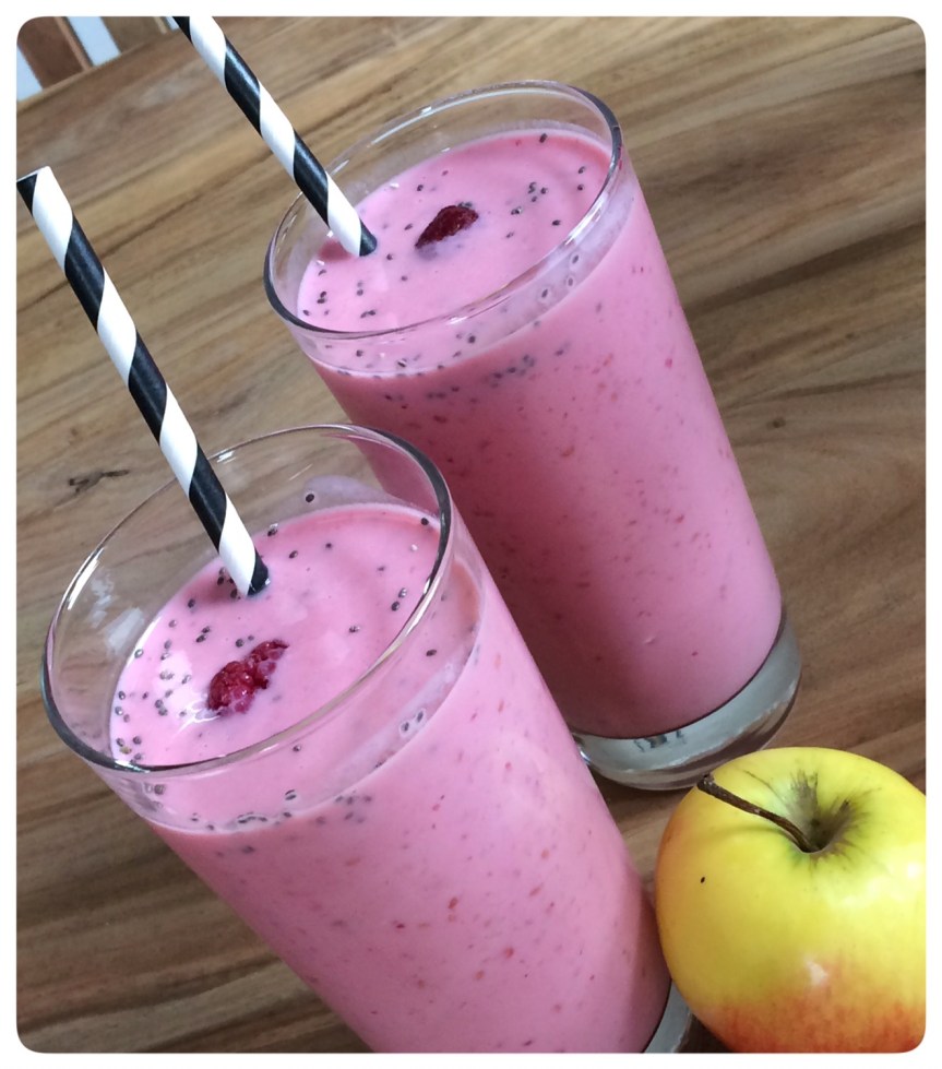 Die Himbeeren gemeinsam mit der Buttermilch, den Apfelsaft und den Saft einer halben Limette in den Mixer geben und pürieren. Das ganze nach Geschmack mit etwas Honig süßen und in Gläser füllen. Die Chiasamen hinzufügen, etwas anquellen lassen und schon ist der Smoothie fertig.
