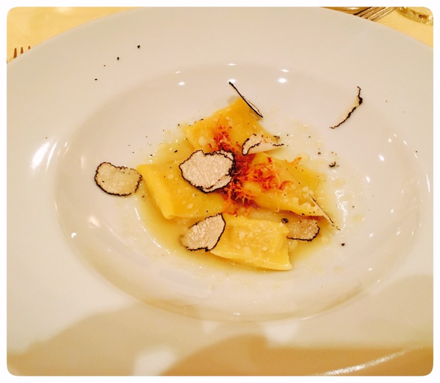 - Hausgemachte Spago Agnolotti Pasta auf Sellerie Mousseline und schwarzer Trüffel