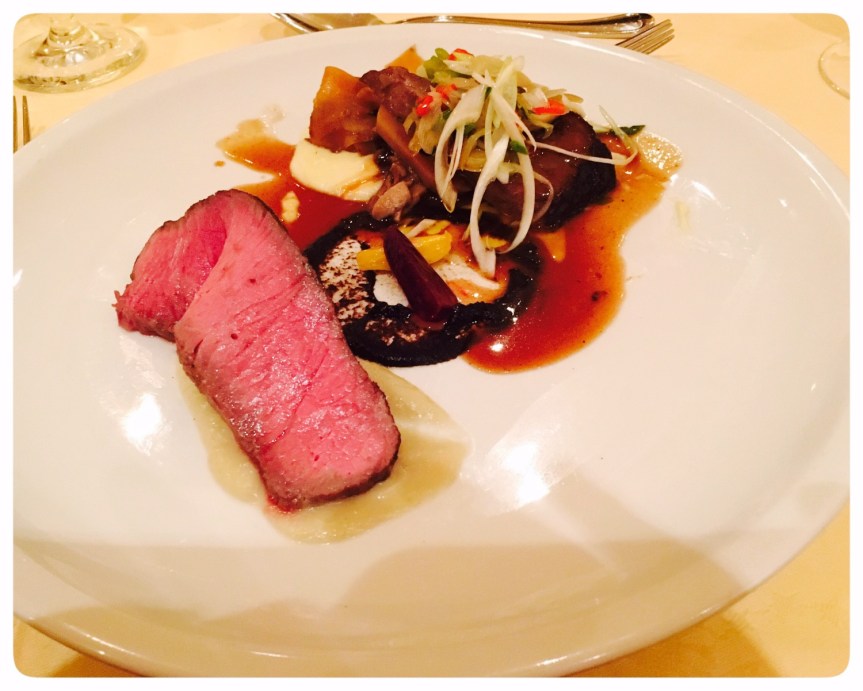 - Rosa gegrillte Beiried New York Cut mit Kohlsprossen und geräucherten Schalotten Purée
