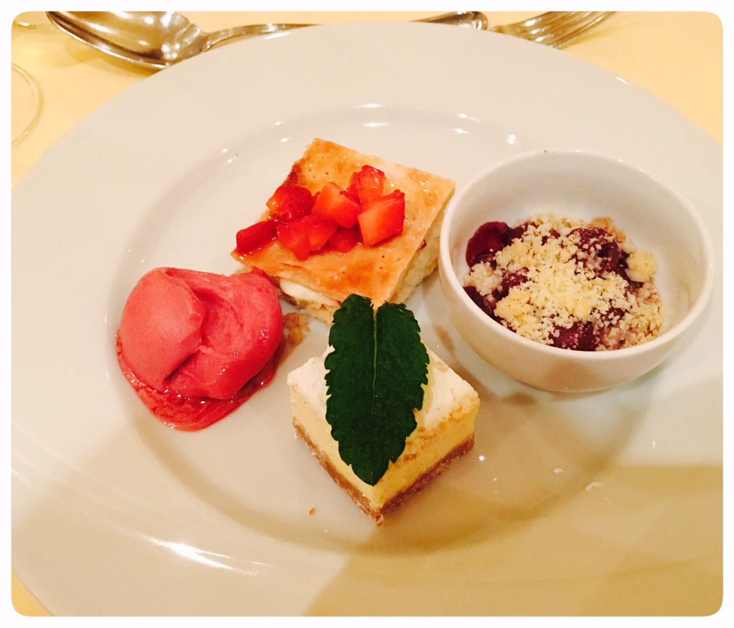 - Califorina cheese ckae, Mille – Feuille Napoleon mit Crème Baumanière und frischen Erdbeeren, überbackene Herzkirschen Streusel, Kirschsorbet mit Ingwer