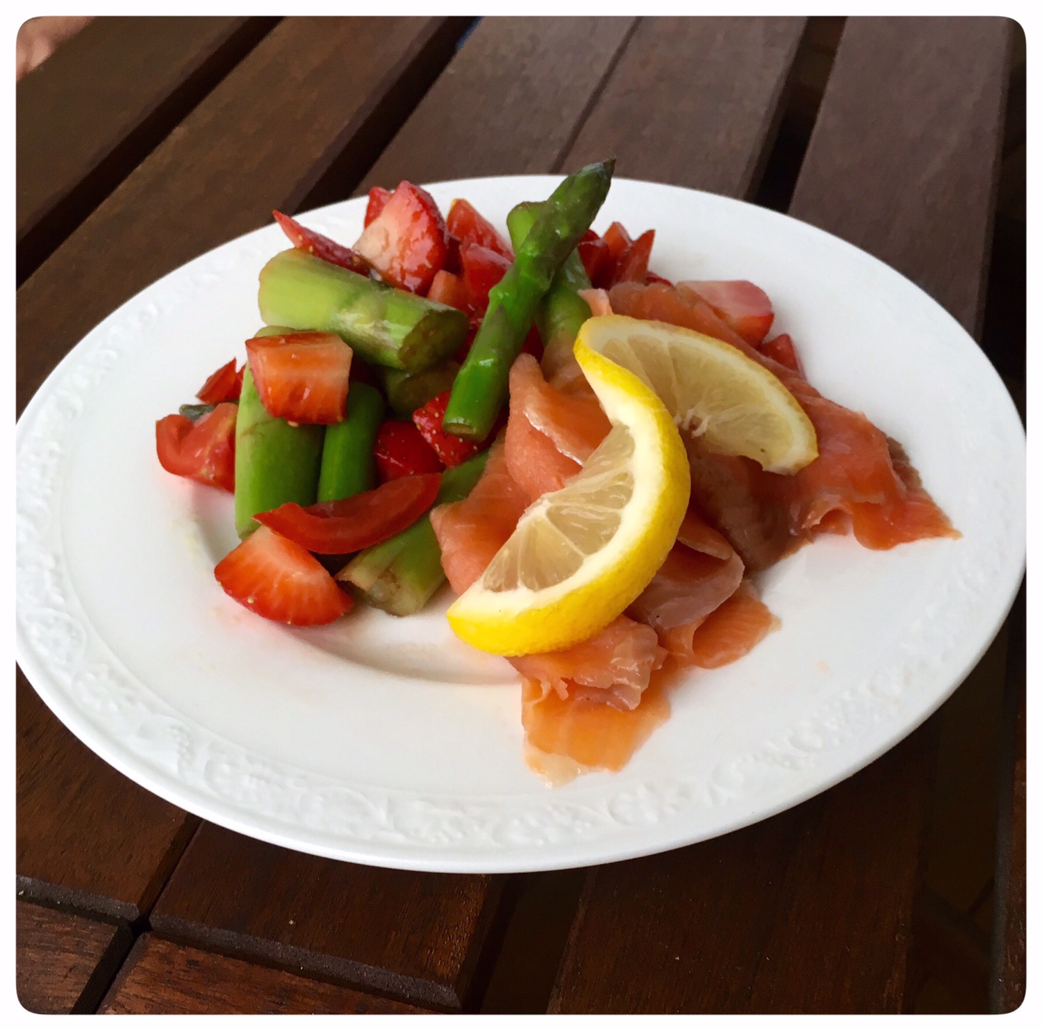 Die holzigen Enden des Spargels entfernen und diesen dann ca. 3 Minuten in Salzwasser kochen (so das er noch Biss hat). Die Erdbeeren und die Tomaten waschen vierteln und gemeinsam mit dem in mundgerechte Stücke geschnittenen Spargel in eine Schüssel geben. Das Ganze mit Balsamio, Nussöl , Salz und Pfeffer marinieren und gemeinsam mit den mit Zitronensaft beträufelten Lachs anrichten!